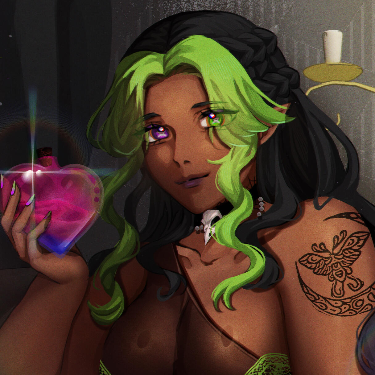 They say she was born when the moon bled into the roots of the world, and the forest cried out for vengeance. Others say she was born of toxic mists and ancient magic due to emerging from the heart of the forest. But a vast majority think both are true because of this one fact The Lunar Bloom had not come for centuries and when it did, every toxic flower in Faerwood opened in unison, and from their overlapping petals, a single form took shape. So was the first theory right? Or the second? Or the third? No one knows for She keeps the forests secrets close to her breast.Her first breath tasted of hemlock and honey. The forest whispered her name into the wind, Elpis, a cruel irony, for it means hope. Her journey only began when she stumbled upon Ventval Woodland and the large grove inside it. She would also find a mystical abode surrounded by bioluminescent fungi and rare flora, all dangerous all deadly. Elpis settled in this home and soon was guided by the forest's whispering secrets, she l discovered her talent for alchemy, mastering the creation of potent poisons and healing elixirs.As she delved deeper into her craft, Elpis formed a profound bond with the forest, becoming its dedicated guardian. Her knowledge of toxicology and herbalism grew, earning her a reputation as a master alchemist and storyteller. Elpis's history is marked by exploration and discovery, as she navigates the delicate balance between nature's beauty and its inherent dangers. Through her journey, Elpis embodies the duality of life, blending empathy with power, and creativity with deep respect for the natural world. But there is cruelty too as she defends her home and world ruthlessly.